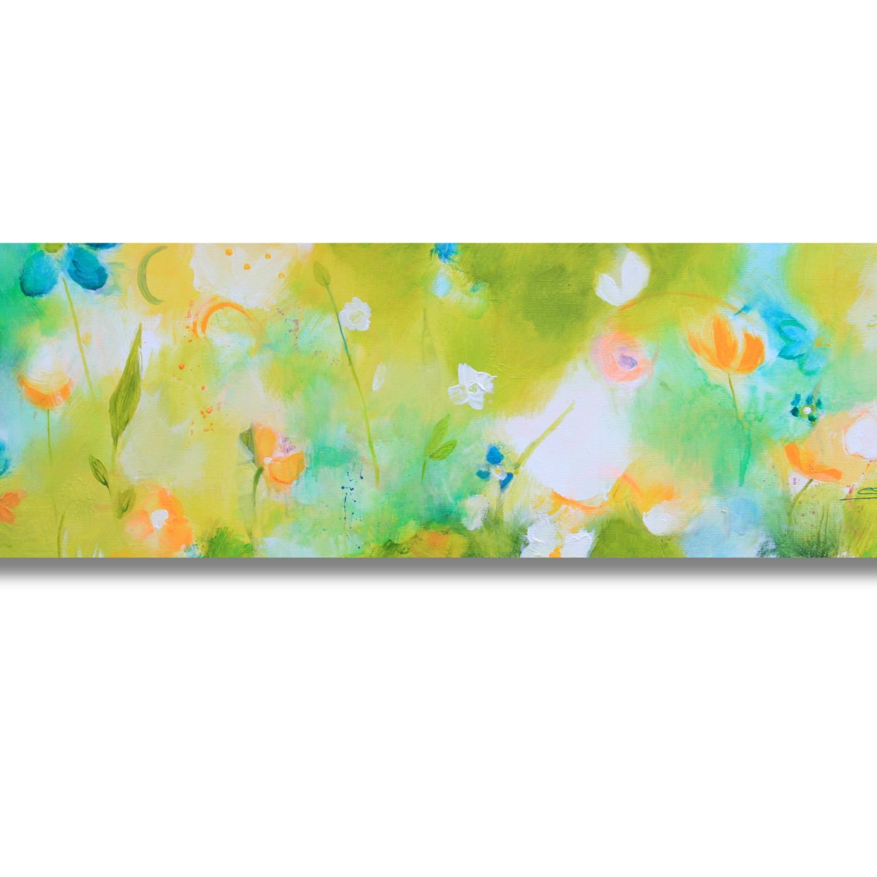 Vergnügte  bin ich mit Pinsel und Farbe über Frühlingswiesen geschlendert. Habe hier und dort entdeckt, wie von Zauberhand zarte Blüten wachsen und wilde Gräser sprießen. Behutsam und voller Freude habe ich ihnen auf der Leinwand geholfen, geboren zu werden.
